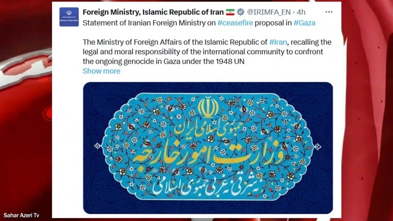 İran İslam Respublikasının Xarici İşlər Nazirliyi Qəzzə zolağında atəşkəslə bağlı irəli sürülən təşəbbüslərə dair bəyanat yayaraq, bildirib: "İran etnik təmizləmənin, müharibə və insanlıq əleyhinə cinayətlərin dayandırılmasına, eləcə də Fələstin xalqının öz müqəddəratını təyinetmə hüququnun təmin olunmasına yönəlmiş bütün təşəbbüsləri daim dəstəkləyib".