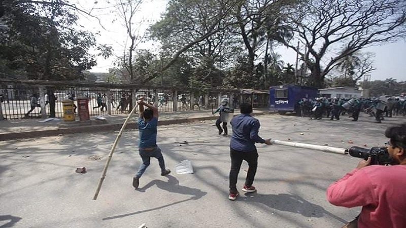 পূর্বঘোষণা অনুযায়ী আজ সকাল ১০টার দিকে ছাত্রদলের বিভিন্ন পর্যায়ের নেতা-কর্মীরা জাতীয় প্রেসক্লাব ও তার আশপাশের এলাকায় জড়ো হতে থাকেন। বেলা ১১টার পর নেতা-কর্মীদের একটি অংশ প্রেসক্লাবের ভেতর থেকে বাইরে বের হওয়ার চেষ্টা করে। তাদের বাধা দেয় পুলিশ। একপর্যায়ে ছাত্রদলের কয়েকজন নেতা-কর্মী বেরিয়ে সড়কে বসে পড়েন। এ সময় পুলিশ তাঁদের লাঠিপেটা করে তুলে দেয়। তারপরই এলাকায় উপস্থিত ছাত্রদল ও বিএনপির নেতা-কর্মীদের সাথে পুলিশের ব্যাপক সংঘর্ষ হয়।
