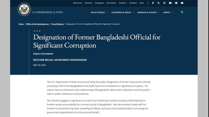 মার্কিন পররাষ্ট্র দপ্তরের মুখপাত্র ম্যাথিউ মিলারকে উদ্ধৃত করে প্রচারিত বিবৃতিতে বলা হয়, "ব্যাপক দুর্নীতিতে সম্পৃক্ততার কারণে সাবেক জেনারেল (অব.) আজিজ আহমেদকে, পূর্বে বাংলাদেশের সেনাবাহিনী প্রধান, ডিপার্টমেন্ট অব স্টেট, ফরেন অপারেশন অ্যান্ড রিলেটেড প্রোগ্রামস অ্যাপ্রোপ্রিয়েশনস অ্যাক্টের ৭০৩১ (সি) ধারার আওতায় অন্তর্ভুক্ত করা হয়। ফলে আজিজ আহমেদ এবং তাঁর পরিবারের সদস্যরা যুক্তরাষ্ট্রে প্রবেশের জন্য অযোগ্য হলেন।"