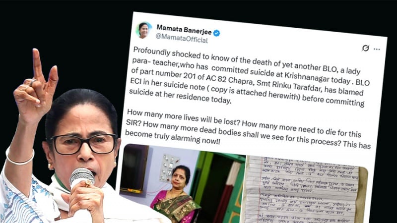 মমতা এক্স পোস্টে আরও লিখেছেন, ‘কৃষ্ণনগরের চাপড়ার ২০১ নং বুথের বিএলও, পার্শ্বশিক্ষিকা রিঙ্কু তরফদারের মৃত্যুর খবর পেয়ে আমি অত্যন্ত মর্মাহত। এসআইআরের কাজে চাপের কথা তিনি লিখে গিয়েছেন সুইসাইড নোটে।’