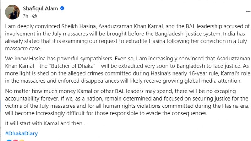আজ (শুক্রবার) সকাল ৯টা ৯ মিনিটে নিজের ভেরিফায়েড ফেসবুক আইডিতে দেওয়া এক পোস্টে তিনি বলেন, ‘আমি গভীরভাবে বিশ্বাসী—শেখ হাসিনা, আসাদুজ্জামান খান কামাল এবং জুলাইয়ের গণহত্যার সঙ্গে জড়িত থাকার অভিযোগে অভিযুক্ত আওয়ামী লীগের নেতৃত্বকে বাংলাদেশের বিচার ব্যবস্থার মুখোমুখি করা হবে। জুলাইয়ের গণহত্যার মামলায় হাসিনা দোষী সাব্যস্ত হওয়ার পর তাকে প্রত্যর্পণের জন্য আমাদের অনুরোধ ভারত ইতোমধ্যে পরীক্ষা করছে বলে জানিয়েছে।’