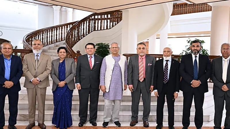 প্রধান উপদেষ্টা অধ্যাপক মুহাম্মদ ইউনূসের সঙ্গে প্রধান নির্বাচন কমিশনার (সিইসি) এ এম এম নাসির উদ্দীনসহ অন্য নির্বাচন কমিশনাররা