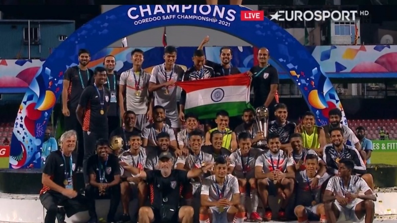 নেপালকে ৩-০ গোলে হারিয়ে ৮ম বারের মতো সাফ চ্যাম্পিয়নশিপে শিরোপা জিতল ভারত। এর আগে ২০১৫ সালে চ্যাম্পিয়ন হয়েছিল ভারত। আর গতবার মালদ্বীপের কাছে হেরে রানার্স হয়েছিল সুনীল ছেত্রীর দল।