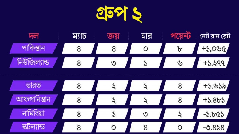 ভারতের সেমি-ভাগ্য এখন নির্ভর করছে নিউজিল্যান্ডের বিপক্ষে আফগানিস্তানের জয়ের ওপর। সেই সঙ্গে এই পর্বে নিজেদের শেষ ম্যাচেও জিততে হবে কোহলিদের। নিউজিল্যান্ডের ভাগ্যও এখন আফগানিস্তানের বিপক্ষে ওই ম্যাচের ওপর নির্ভর করছে। আফগানদের হারাতে পারলেই কিউইদের সেমি নিশ্চিত। সেক্ষেত্রে নেট রান রেটের হিসাব কোনো কাজেই আসবে না।