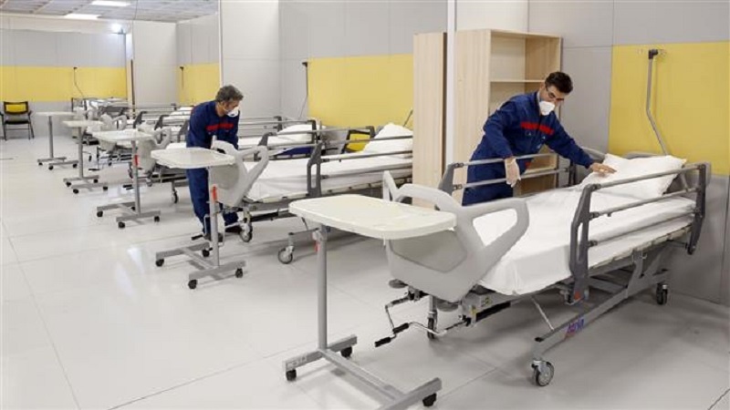 করোনাভাইরাস মোকাবেলায় ইরানে তৈরি একটি অস্থায়ী হাসপাতালে কাজ করছেন কর্মীরা