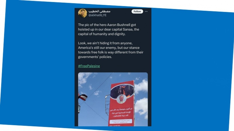 ইয়েমেনের অন্যতম আন্দোলনকারী মুস্তফা আল-খতিব ওই বিলবোর্ডের ছবি তুলে নিজের এক্স পেজে প্রকাশ করেন। সেখানে তিনি লিখেছেন, “আমাদের রাজধানী সানা যেটি মানবতা ও মর্যাদার রাজধানী হিসেবে পরিচিতি পেয়েছে সেখানে আমাদের বীরপুরুষ আরন বুশনেলের ছবি প্রকাশ পেয়েছে।”
