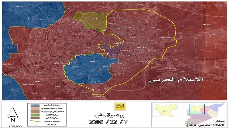 যুদ্ধক্ষেত্রের বাস্তবতার ভিত্তিতে তৈরি একটি মানচিত্রে দেখা গেছে, সিরিয়ার সেনাবাহিনী পূর্ব আলেপ্পোর দুই-তৃতীয়াংশের বেশি এলাকা পুনর্দখল করেছে। কিছুদিন আগ পর্যন্ত গোটা পূর্ব আলেপ্পো বিদেশি মদদপুষ্ট সন্ত্রাসীদের নিয়ন্ত্রণে ছিল।