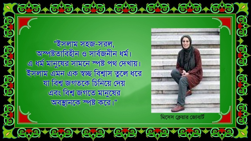 নও-মুসলিম মিসেস ক্লেয়ার মনে করেন, "ইসলাম সহজ-সরল, অস্পষ্টতাবিহীন ও সার্বজনীন ধর্ম এবং এ ধর্ম মানুষের সামনে স্পষ্ট পথ দেখায়। ইসলাম এমন এক স্বচ্ছ বিশ্বাস তুলে ধরে যা বিশ্ব জগতকে চিনিয়ে দেয় এবং বিশ্ব জগতে মানুষের অবস্থানকে স্পষ্ট করে।"
