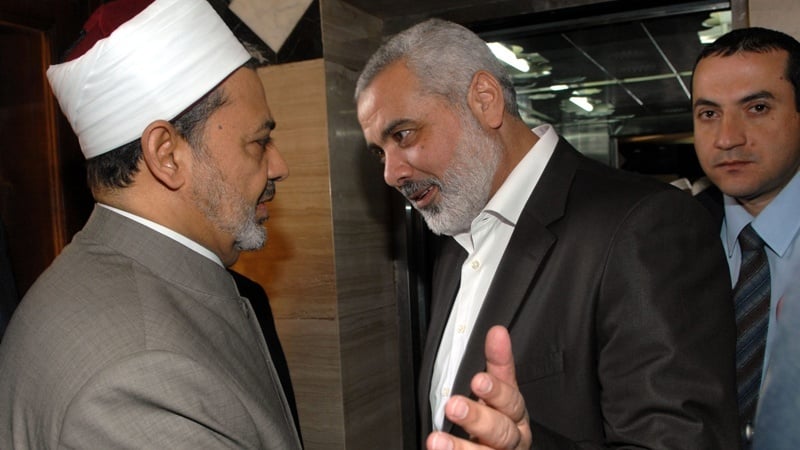 হামাসের রাজনৈতিক ব্যুরোর প্রধান শহীদ ইসমাইল হানিয়ের পাশে শেখ আল-আজহারের ছবি