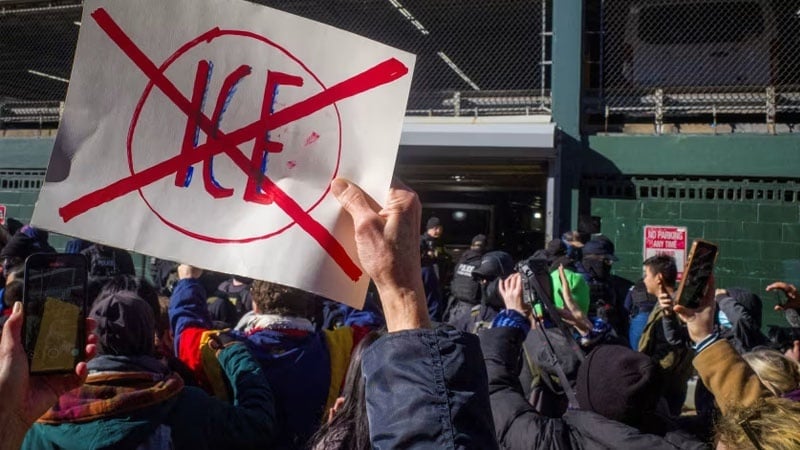 মার্কিন যুক্তরাষ্ট্রের ম্যানহাটনে বিক্ষোভকারীরা জেনারেল সার্ভিসেস অ্যাডমিনিস্ট্রেশন (জিএসএ) পার্কিং লটের কাছে প্ল্যাকার্ডসহ সমবেত হয়েছে যাতে ফেডারেল এজেন্টদের দেশ ছেড়ে যেতে না দেওয়া হয়!