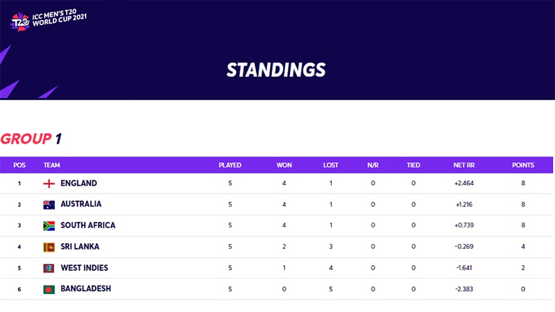 গ্রুপ-ওয়ানে ইংল্যান্ড-অস্ট্রেলিয়া ও দক্ষিণ আফ্রিকা তিন দলের পয়েন্ট সমান ৮ হলেও শ্রেয়তর রানরেটে গ্রুপ সেরা হয়েছে ইংল্যান্ড, দ্বিতীয় হয়েছে অস্ট্রেলিয়া। বিদায় নিতে হয়েছে দক্ষিণ আফ্রিকাকে।#