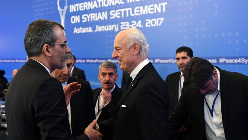 Husejn Džaberi Ensari, savjetnik za pitanja arapskih i afričkih zemalja ministra vanjskih poslova IR Iran tokom sastanka sa Stefan De Misturom, specijalnim izaslanikom UN-a za pitanje Sirije analizirao je posljednja previranja u Siriji. Džaberi Ensari nalazi se na čelu iranske visoke delegacije tokom mirovnih pregovora u Astani, on je ukazao na značajnu ulogu UN-a u postizanju dijaloga između sirijskih grupa te je istakao da Iran, Rusija i Turska nisu zamjena za međunarodnu grupu podrške za Siriju (ISSG). Stefan De Mistura tokom sastanka izrazio je nadu da će mirovni pregovori u Astani doprinijeti rješenju sirijske krize. Visoke delegacije iz Turske, Rusije i Irana doputovale su u subotu kako bi prisustvovale današnjim sirijskim mirovnim pregovorima koji se održavaju u Astani.