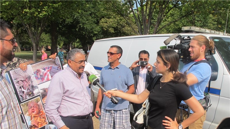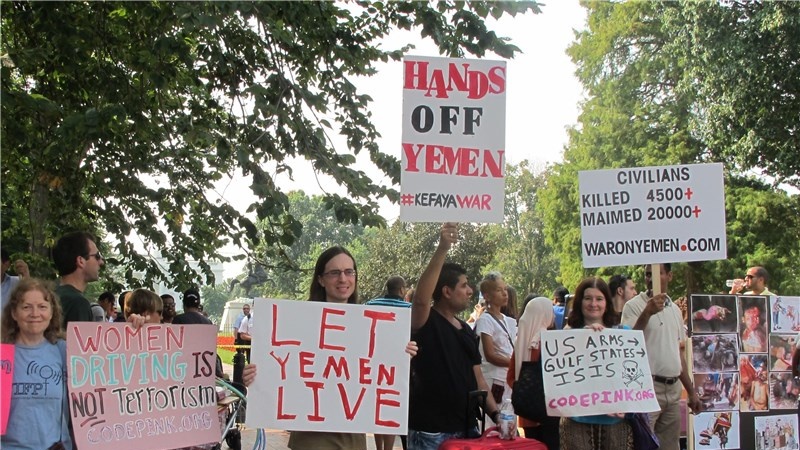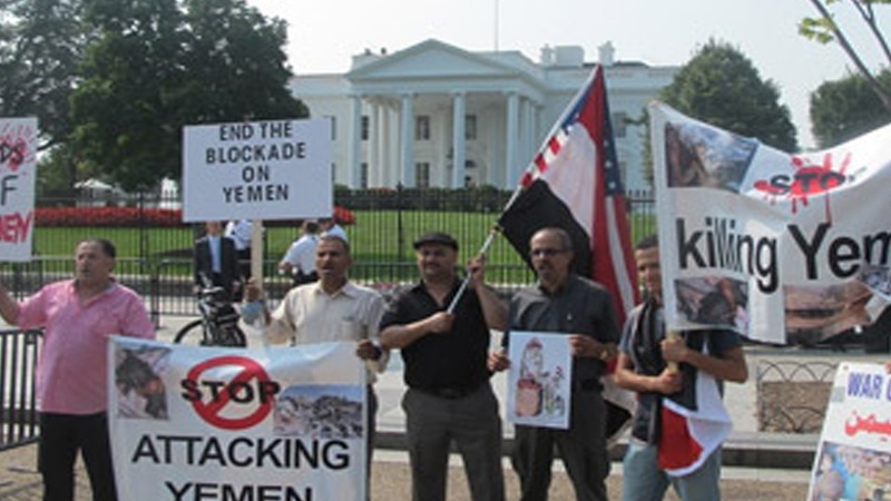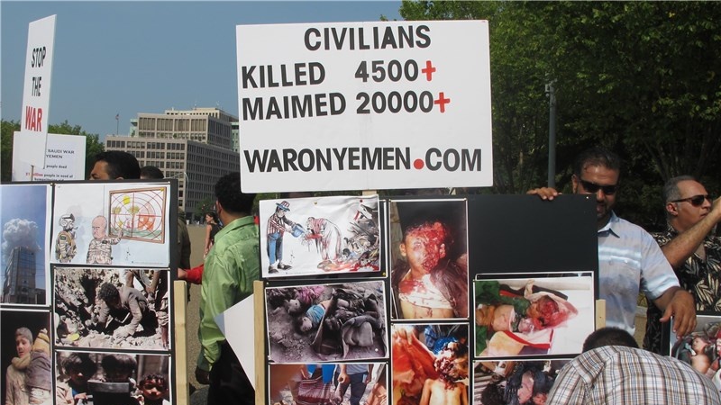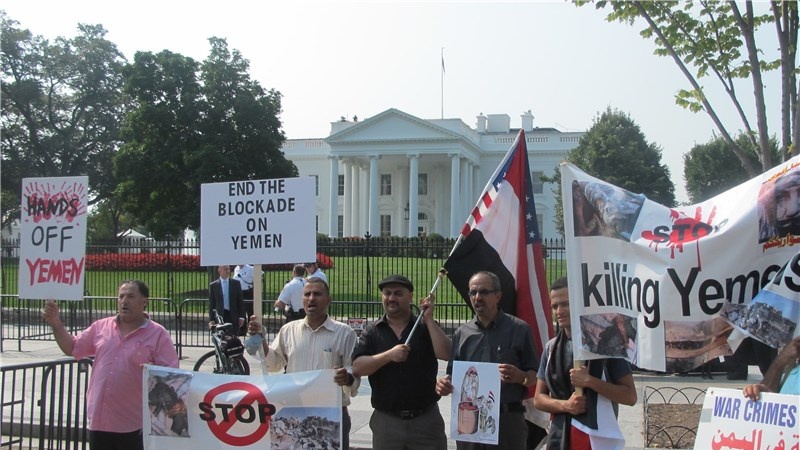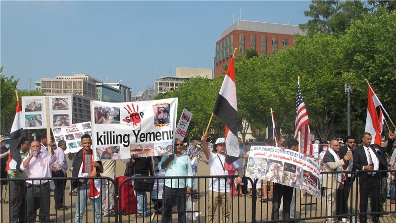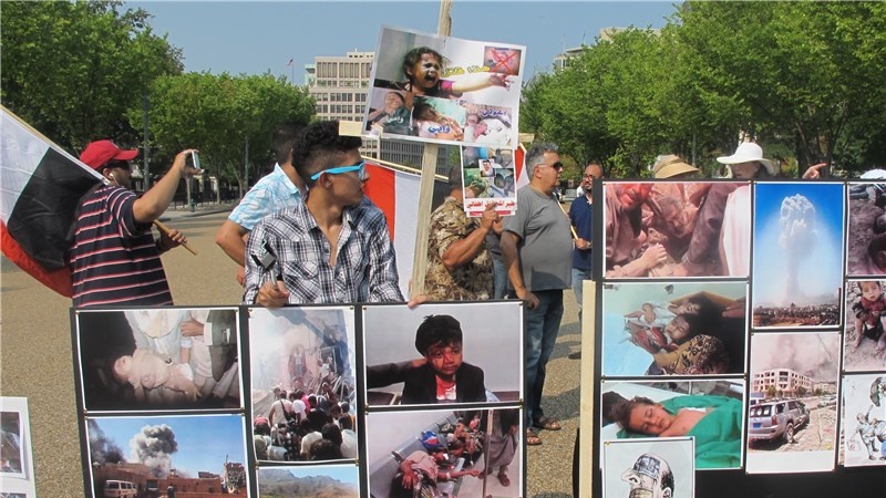 Novinska agencija Tasnim iz Washingtona javlja da su socijalni i aktivisti za ljudska prava koji su se učestvovali na ovom protestnom skupu, u rukama nosili transparente na kojima je pisalo: ''Saudijci ubijaju žene i djecu'', ''Pustite Jemene na miru'', i ''Zaustavite rat''. Jedan od organizatora ovog protestnog okupljanja je na pitanje novinara agencije Tasnim, rekao: ''Došli smo da ovdje da dignemo svoj glas protiv antihumanog rata usmjerenog protiv nebranjenog jemenskog naroda.'' On je u nastavku rekao: ''Tokom ovog rata izvršeni su ratni zločini, a odgovorni za zločine moraju biti procesuirani. međutim, Saudijska Arabija je svojim novcem i bogatstvom uspjela obuzdati sve informativne i pravne organe.''tagovi