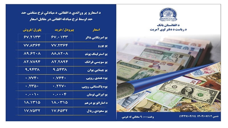 اعلام نرخ مبادله افغانی با اسعار خارجی -شنبه دوازدهم میزان 1404