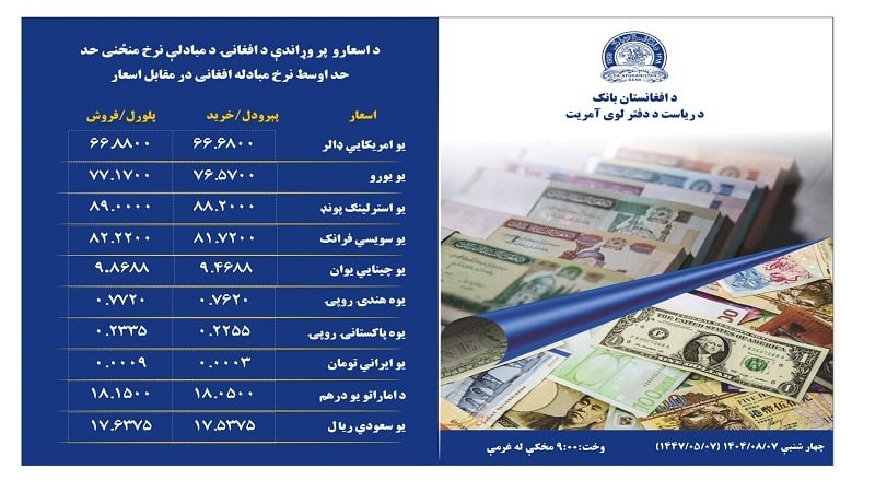 اعلام نرخ مبادله افغانی با اسعار خارجی -چهارشنبه هفتم عقرب 1404