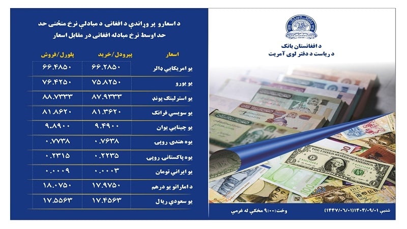 بانک مرکزی افغانستان در اطلاعیهای نرخ مبادله افغانی با ارزهای خارجی را در روز شنبه یکم قوس 1404 اعلام کرد.