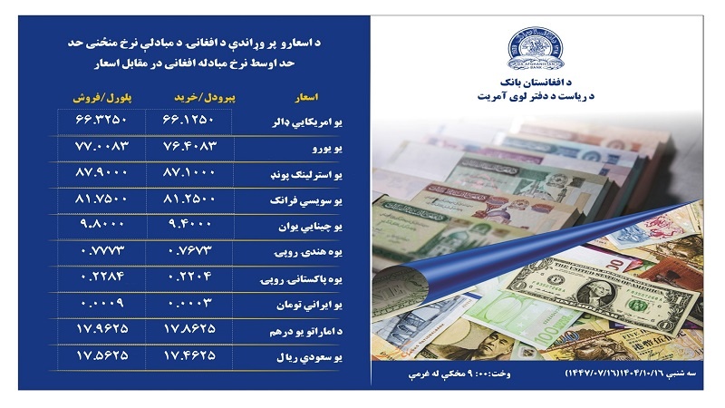 بانک مرکزی افغانستان در اطلاعیهای نرخ مبادله افغانی با ارزهای خارجی را در روز سهشنبه شانزدهم جدی 1404 اعلام کرد.