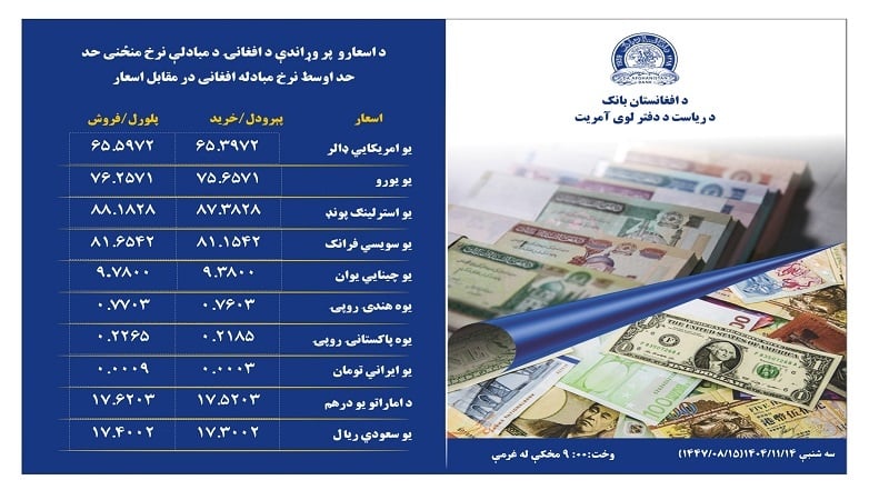 به گزارش رادیو دری، براساس اعلام بانک مرکزی افغانستان نرخ مبادله افغانی در مقابل سایر اسعار/ارزها براساس معاملات سرای شهزاده کابل به شرح زیر اعلام شده است: