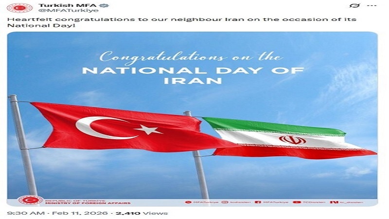 صفحه رسمی «وزارت خارجه ترکیه» در شبکه اجتماعی ایکس، با انتشار تصویری از پرچم ترکیه و ایران در کنار یکدیگر، نوشت: «روز ملی ایران را صمیمانه به کشور همسایه مان ایران تبریک میگوییم.»