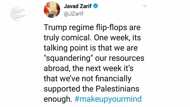 به گزارش ایرنا، «محمد جواد ظریف» در توییتر نوشت، «تغییر مواضع ناگهانی رژیم ترامپ واقعا خندهدار است. یک هفته، محور اظهاراتشان این است که ما داریم منابعمان را در خارج از مرزهایمان "هدر میدهیم". هفته بعد میگویند که به اندازه کافی از فلسطینیها حمایت نکردهایم.»