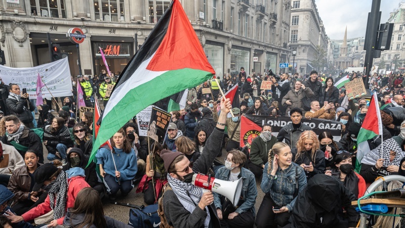 ParsToday- Am Samstag demonstrierten verschiedene Teile der Bevölkerung sowie eine Reihe britischer Friedensaktivisten vor dem Büro des britischen Premierministers, um gegen den Völkermord Israels im Gazastreifen zu protestieren.