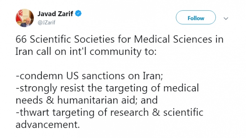 Zarif forderte in seinem Tweet die Weltgemeinschaft auf, die anti-iranischen US-Sanktionen und vorallem jene, die auf die medizinischen Bedürfnisse der Bevölkerung sowie Forschung und Entwicklung in diesem Bereich abzielen, zu verurteilen.