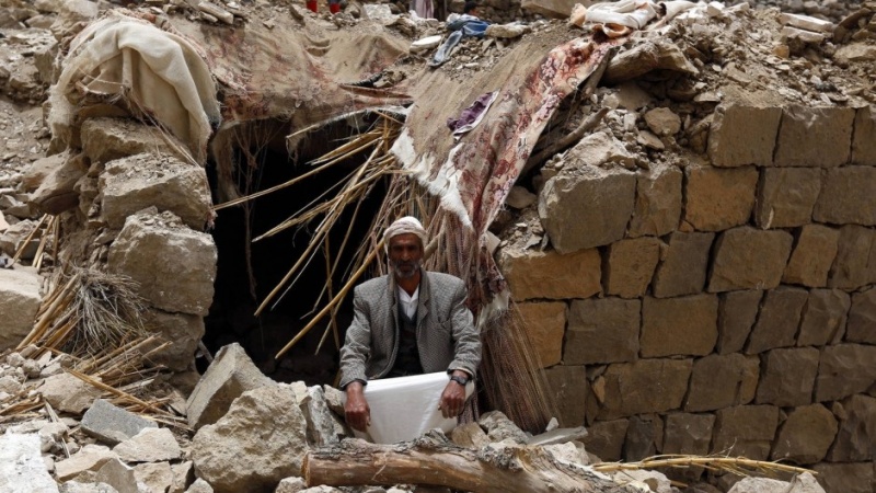 Ein Yemenit sitzt vor den Trümmern seines Hauses in dem Ort Hajer Akash, das mutmaßlich durch saudi-arabische Luftangriffe zerstört worden ist.