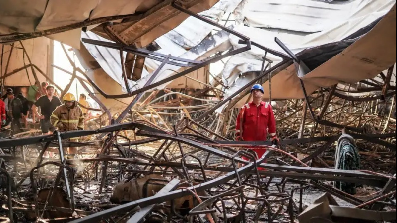 Auf Bildern der Katastrophe war eine teilweise eingestürzte und ausgebrannte Halle zu sehen. Rettungskräfte suchten unter Trümmern der ausgebrannten Halle nach Überlebenden.