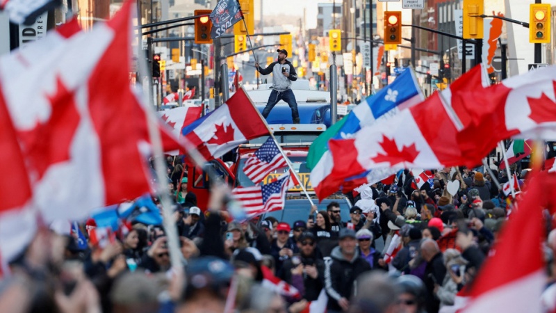 Mehrere hupende LKW-Fahrer und Demonstranten, die auf Pickups und Autos standen und „Freiheit“ riefen, marschierten durch die Innenstadt von Ottawa, als die Polizei zusätzliche Kräfte entsandte, um gegen die Teilnehmer vorzugehen. Lokale Medien behaupteten, dass mehrere von ihnen auch am Februar an den Protesten teilgenommen hatten, die gegen eine Impfverordnung für grenzüberschreitende LKW-Fahrer geführt wurden.