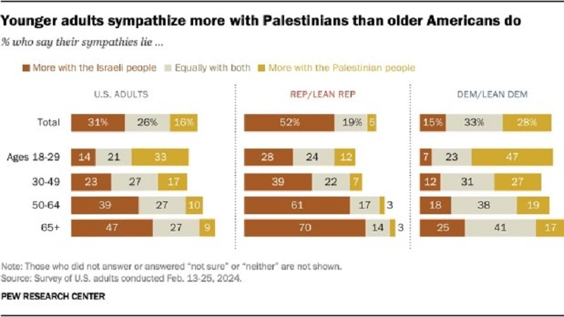 Eine aktuelle Pew-Umfrage zeigt, dass junge Amerikaner mehr mit dem palästinensischen Volk sympathisieren als mit den Israelis. Dem Bericht zufolge gibt ein Drittel der amerikanischen Erwachsenen unter 30 Jahren an, vollständig oder größtenteils mit dem palästinensischen Volk zu sympathisieren, während 14 Prozent mit den Israelis sympathisieren.