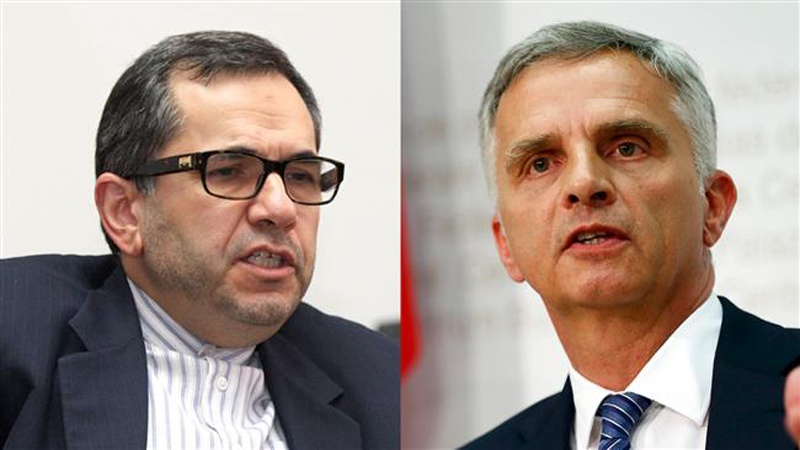 Swiss Foreign Minister Didier Burkhalter (L) and Iran's Deputy Foreign Minister for European and American Affairs Majid Takht-e Ravanchi
