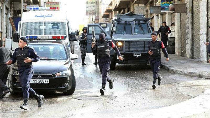 Jordanian forces are seen securing a street in the town of Irbid, 80 kms north of Amman near the border with Syria, on March 2, 2016, following a security operation targeting a group of suspected militants. (AFP photo)