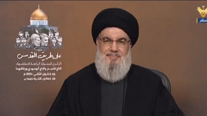 In a televised speech delivered on Wednesday, Sayyed Hassan Nasrallah offered his condolences on the martyrdom of the deputy head of the Hamas politburo, Saleh al-Arouri, and five of his comrades who were killed a day earlier in a drone strike on their office in southern Beirut.