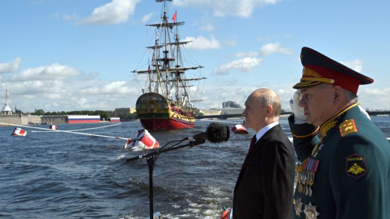 Putin, accompanied by Defence Minister Sergei Shoigu and Admiral Nikolai Yevmenov, the Head of the Navy, inspected the ships from a launch boat on the Neva before making a speech.