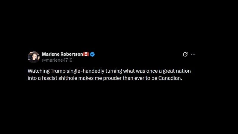 One user, Marlene Robertson, wrote: “Watching Trump single-handedly turn a country that was once great into a fascist dump makes me prouder than ever to be Canadian.”