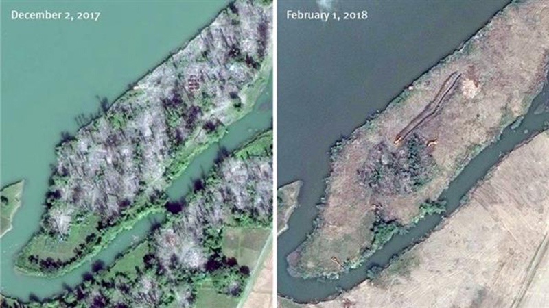 Satellite imagery from Colorado-based DigitalGlobe that were handed to the Associated Press on Friday showed that at least 28 depopulated villages had been leveled by bulldozers and other machinery in a 50-kilometer radius around the town of Maungdaw in western Rakhine State between December 2017 and February this year.