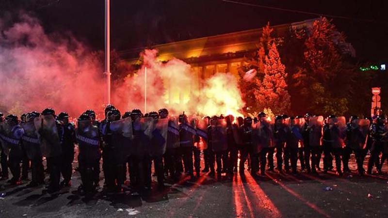 In Bucharest, some protesters attempted to force their way through security lines guarding the government building. Others threw bottles and rocks at riot police, who said groups of "provocateurs" were present in the square.