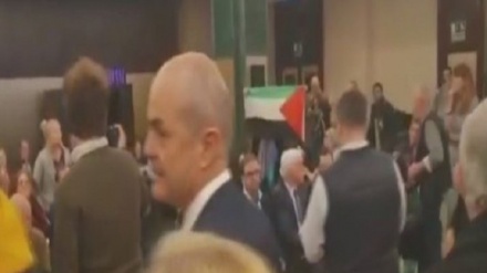 Dic 13, 2019 07:46Un grupo de activistas del movimiento BDS interrumpe un evento proisraelí celebrado en España y califica a ese régimen de “criminal de guerra”.