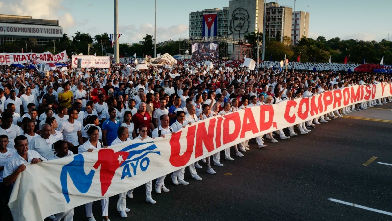 Miles de cubanos se manifiestan en La Habana para respaldar al Gobierno venezolano y condenar las políticas injerencistas de EE.UU., 1 de mayo de 2019.