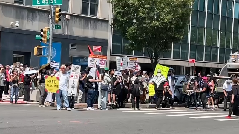 En la manifestación antisionista, celebrada frente a las Naciones Unidas y junto a la Misión Permanente de Estados Unidos en la ciudad de Nueva York, los participantes también exigieron, mediante lemas y volantes, el fin de la ocupación de Palestina, un alto el fuego en Gaza y ayuda adecuada a la población de Gaza.