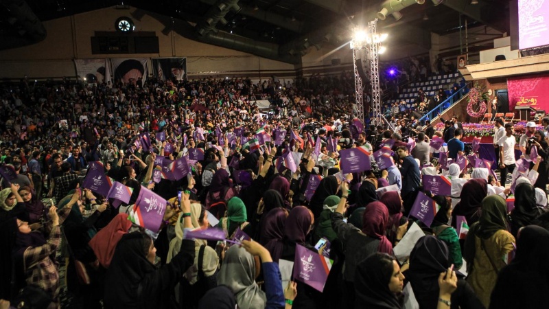 Hasan Rohani, presidente iraní y candidato a la reelección, en un mitin electoral celebrado en la ciudad de Teherán (capital) ante sus partidarios, defendió su desempeño durante sus cuatro años de mandato.