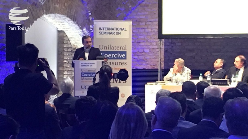 En declaraciones sostenidas el jueves en el Seminario Internacional titulado “Sanciones unilaterales y sus impactos” en la capitalina ciudad austriaca de Viena, el vicecanciller iraní para Asuntos Políticos, Seyed Abás Araqchi respecto a las sanciones unilaterales e ilegales de EE.UU., hizo un llamado a la comunidad internacional para que enfrente el unilateralismo estadounidense, al mismo tiempo, subrayó y recordó la responsabilidad internacional de los que imponen las sanciones unilaterales.