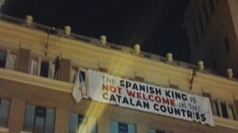 Según confirman a EL MUNDO fuentes de los Servicios de la Seguridad del Estado fue detectado durante los últimos días el encargo de un cartel de unos 60 metros cuadrados con una proclama que rechaza la presencia del monarca y en la que se subraya en inglés que "no es bienvenido en Cataluña", como finalmente han mostrado en el número 9 de la Plaza de Cataluña.