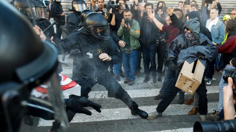 A lo largo de la mañana del sábado se han producido varias cargas por parte de los Mossos d’Esquadra cuando miembros de los CDR han intentado sobrepasar los cordones policiales. El cuerpo autonómico ha extremado las precauciones registrando mochilas y bolsos a la salida del metro y Rodalies. Los momentos de más tensión se han producido cuando algunos CDR han intentado sobrepasar el cordón policial y han acabado lanzando pintura y bengalas a los agentes.