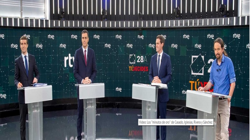 El lunes, los líderes de Podemos, el Partido Popular (PP), el Partido Socialista Obrero Español (PSOE) y Ciudadanos (C’s), Pablo Iglesias, Pablo Casado, Pedro Sánchez y Albert Rivera, respectivamente, se reunieron en los estudios de la cadena local TVE para abordar y discutir varios temas relevantes; un evento que podría determinar el voto de cerca del 30 % de indecisos entre el electorado español.