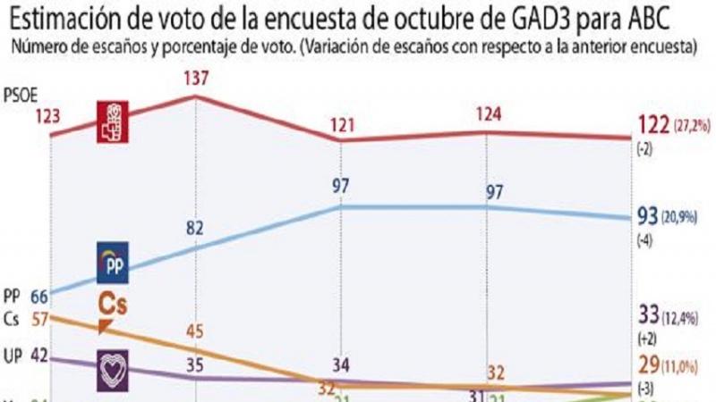 El principal beneficiado de esa fuga de electores es el Partido Popular, que se consolida por encima de los 90 escaños, frente a un PSOE que se estanca y continúa muy lejos de las expectativas que tenía de mejorar con claridad los resultados de abril, según informó ABC.
