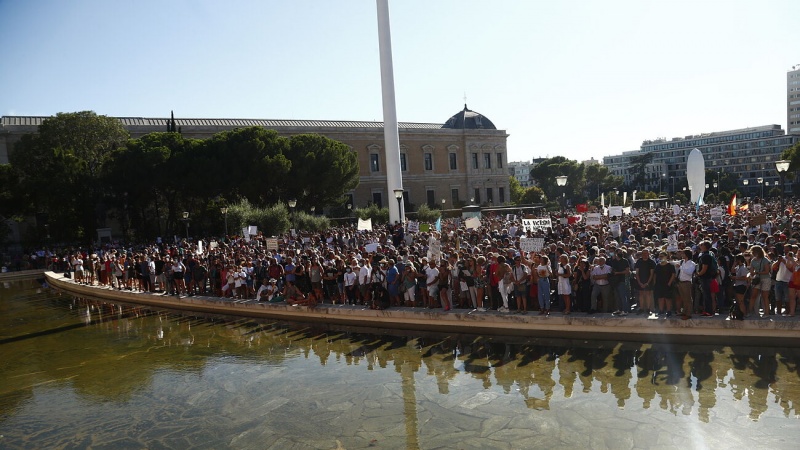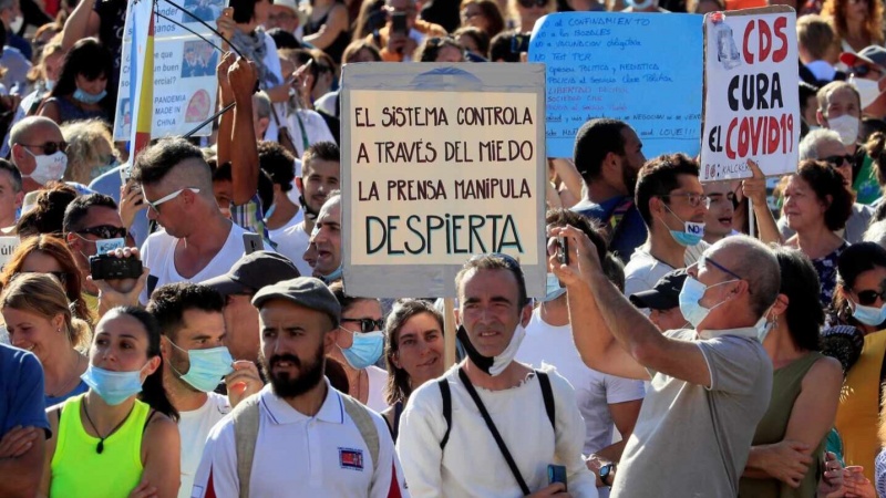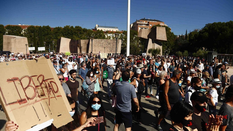 Muchos sin mascarilla o con ella bajada y sin respetar la distancia de seguridad. Entre 2.500 y 3.000 personas, según Delegación de Gobierno, con el argumento de que la pandemia es una farsa, se concentraron este domingo en la plaza de Colón de Madrid para protestar contra el uso obligatorio de las mascarillas y demás medidas adoptadas por el Gobierno para luchar contra el coronavirus, reportó El Mundo.