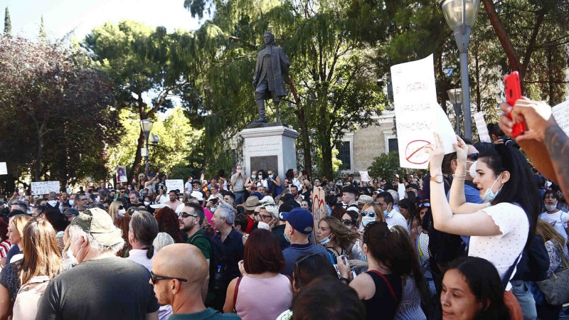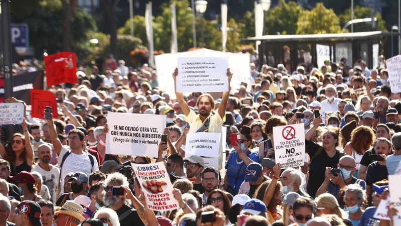 "Estoy aquí para denunciar que estamos perdiendo nuestros derechos civiles sin razón científica ninguna", dijo Fernando, quien trabaja como médico homeópata en Canadá, y se desplazó desde Málaga , donde está pasando unos meses. "Yo quiero que me abran un cadáver y saquen el virus. Cuando me demuestren que existe, lo valoraré y veré la respuesta", añadió sin mascarilla ninguna puesta. Explicó que tiene "excepción" para llevarla pero que el porqué es privado. La Policía pidió la documentación y tomó nota de los DNI a muchas de las personas que no la portaban. "Algo rechina, algo nos están contando mal. No me creo nada de lo que dicen en las noticias y estoy buscando información en otro sitio", explicaba una jubilada madrileña de 65 años cerca de una pancarta en la que se leía: "Las multinacionales tienen licencia para matar despacio. No a la vacuna obligatoria Covid-19".