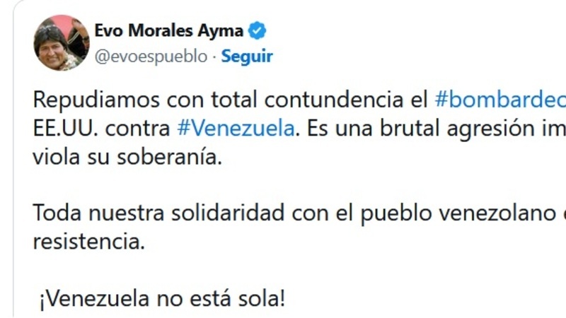 El expresidente de Bolivia, Evo Morales también expresó su repudio al ataque aéreo estadounidense contra el territorio venezolano.