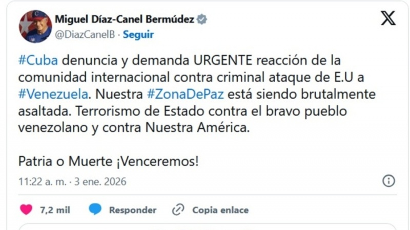 Según telesurtv.net, Tras el reciente ataque de Estados Unidos contra Venezuela, el presidente de Cuba, Miguel Díaz-Canel, denunció el «ataque criminal» de EE.UU., tachando tales agresiones de «terrorismo de Estado».